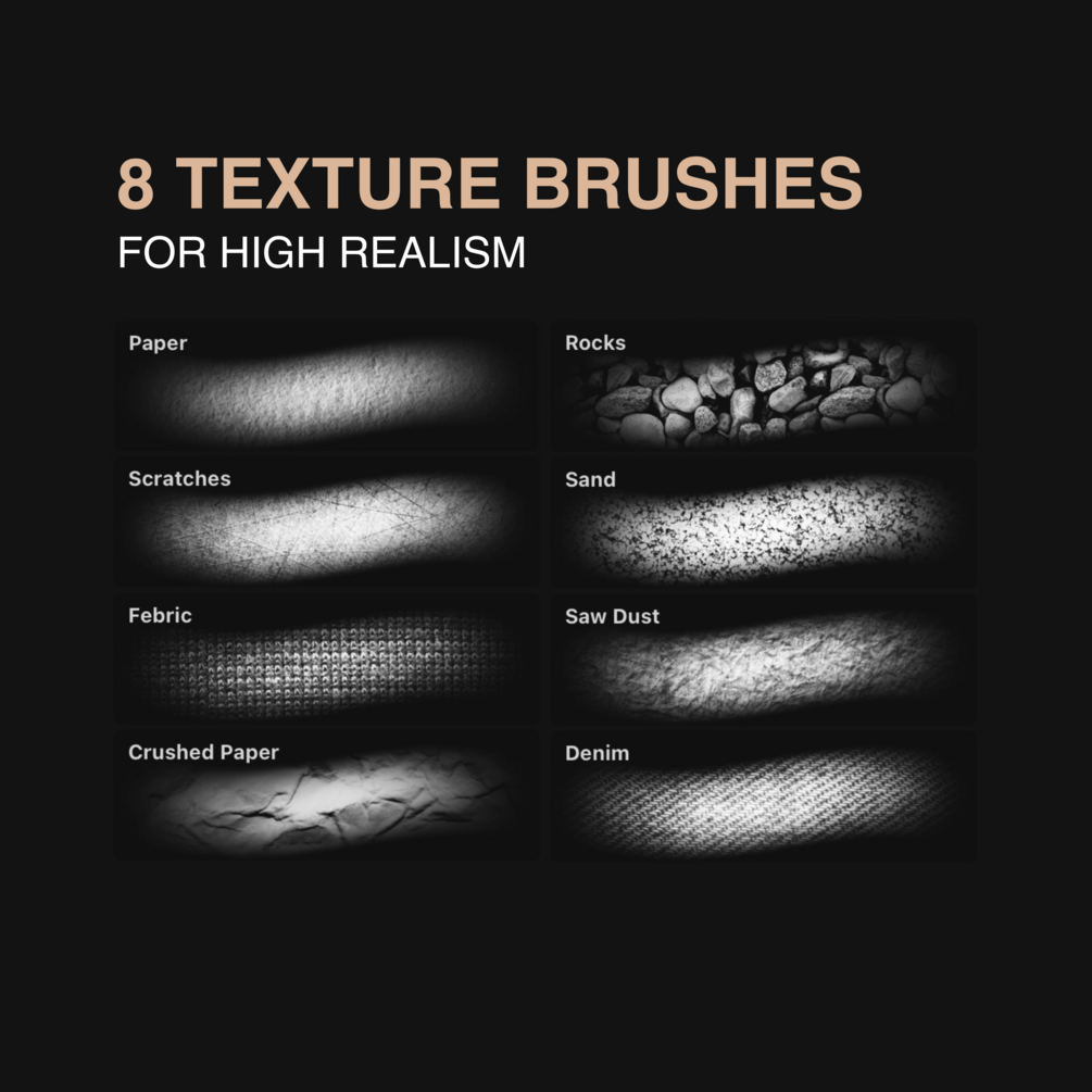 ✔️ 8 High-quality and Realistic texture brushes with continuous seamless textures.